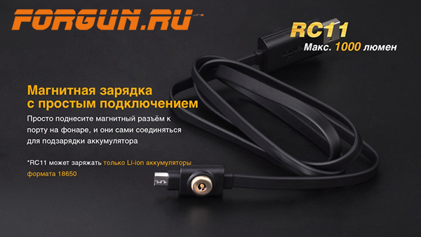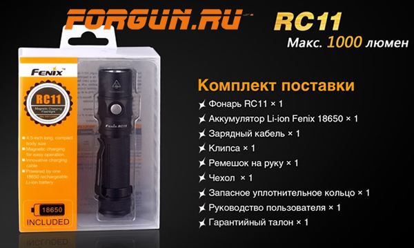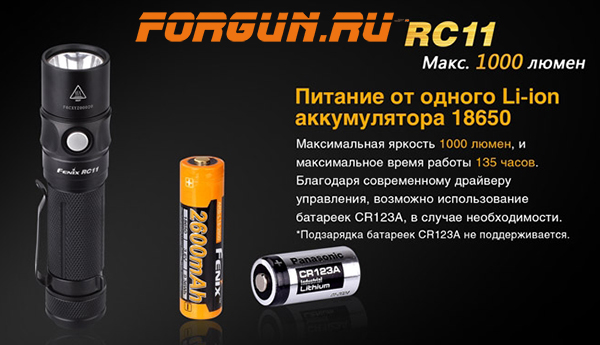 Фонарь Fenix RC11 работает от 18650 Li-ion аккумуляторов, но также допускается использование литиевых батарей CR123A в экстренных случаях.