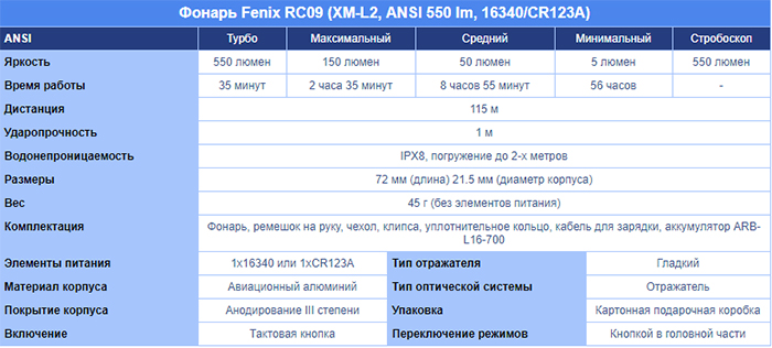 Элементы питания: 1 х 16340 аккумулятор Li-ion или 1 х CR123A литиевая батарея – может использоваться в экстренной ситуации