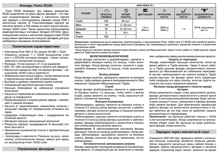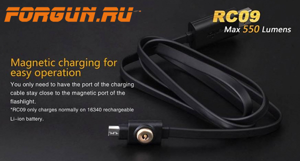Fenix RC09 отличный фонарь своего класса. Не каждая модель компании Fenix может похвастаться магнитным портом для зарядки аккумулятора, а на конце кабеля, что идёт в комплекте, есть ещё и микро USB. Это очень удобно, поскольку одним кабелем можно заряжать одновременно и фонарь, и смартфон.