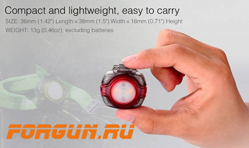 Вес фонаря всего 13 грамм и при этом он обладает 4 режимами яркости, включая красный свет.