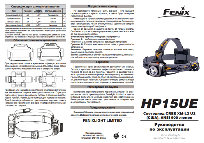 Примечание: Вышеуказанные параметры (протестированы в лаборатории с использованием фирменных аккумуляторов Fenix Ni-MH емкостью 2500 мАч) являются приблизительными и могут варьироваться между различными фонарями при использовании различных элементов питания и в различной окружающей среде.