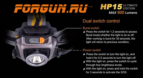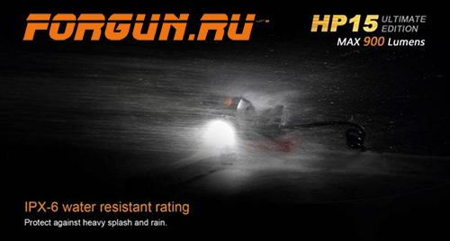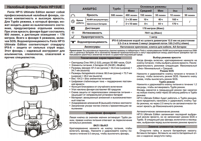 Всего в фонаре 6 режимов, включая SOS. Водонепроницаемость Fenix HP15 Ultimate Edition соответствует стандарту IPX-6 - защита от сильных струй воды. Этот фонарь - надежный инструмент для альпинистов, спелеологов, спасателей и прочих специалистов.