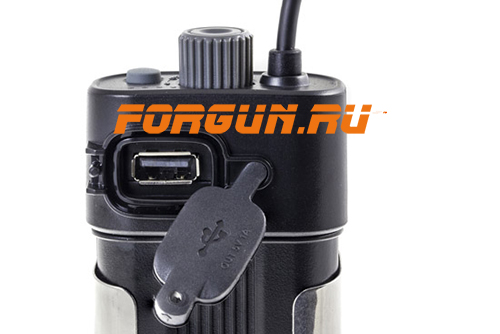 Сфокусированный луч дает дальность освещения 233 метра. При необходимости электронные устройства могут подзарядиться от USB порта на батарейном отсеке.