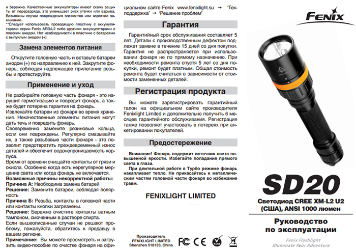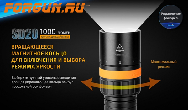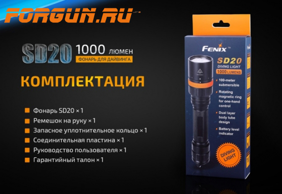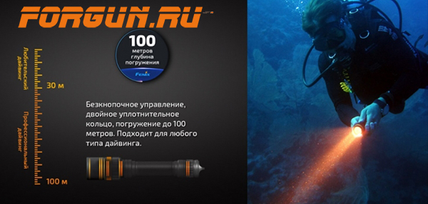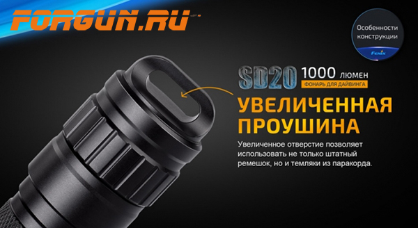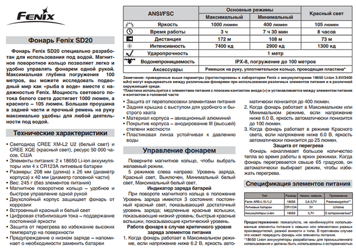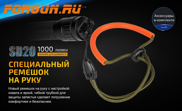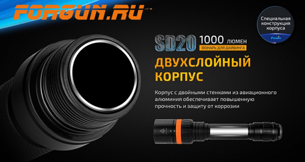 Fenix SD20 – это усовершенствованная модель специализированного фонаря, для дайвинга и работ на глубине не более 100 метров. Благодаря дополнительной внутренней колбе в корпусе, увеличена надёжность при погружении.