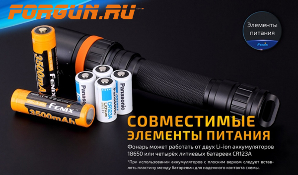 Яркость луча в 1000 люмен белого света, и 105 люмен красного света, обеспечивают два элемента 18650, либо 4-е элемента CR123A.