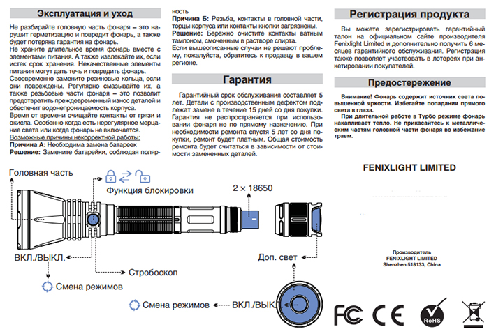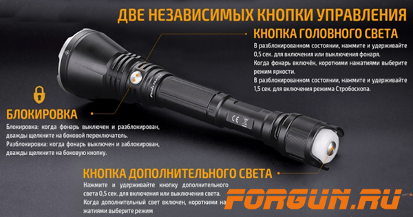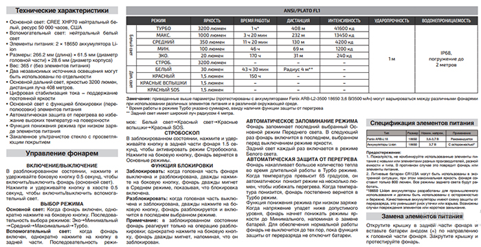 Вспомогательный, излучаемый на торце свет, управляется кнопкой, расположенной в центре самого излучателя. Наличием 9-ти режимов в сумме, головного и торцевого излучателя, может похвастаться далеко не каждая модель Fenix. Шагая в ногу с инновационными технологиями, компания Феникс использует современные элементы защиты для долгой эксплуатации. Защита от перегрева позволяет не выйти светодиодам из строя при перегреве.