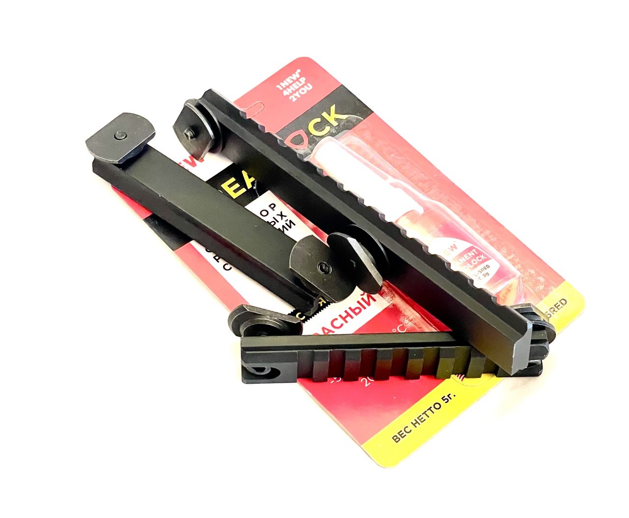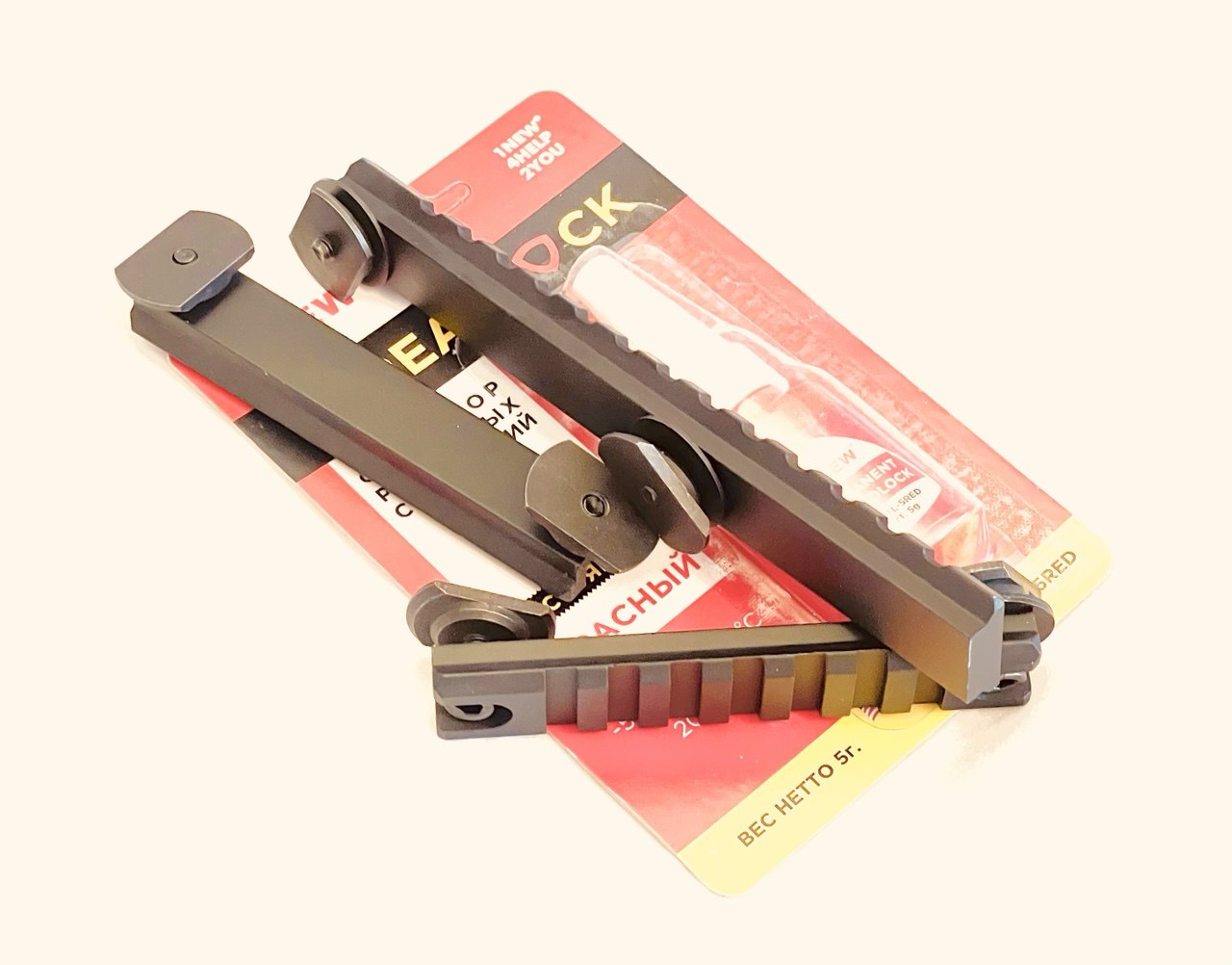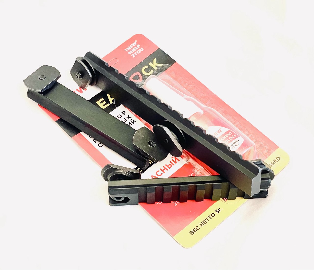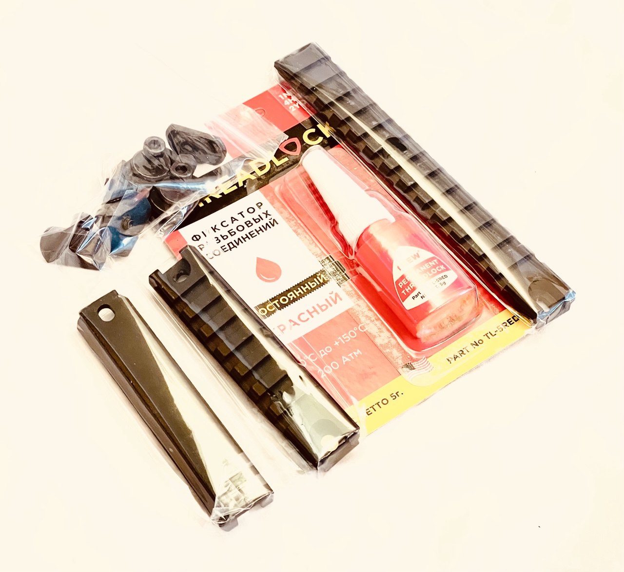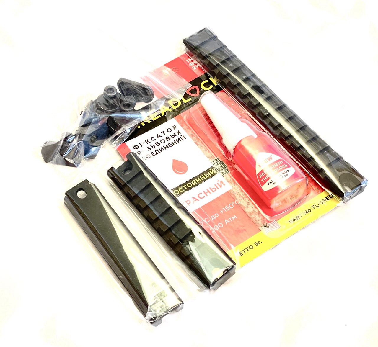 Комплект состоит из 3-х планок типа Weaver/Picatinny для установки различных приспособлений имеющих крепления типа вивер/пикатинни на кожух ствола и красного фиксатора резьбовых соединений.