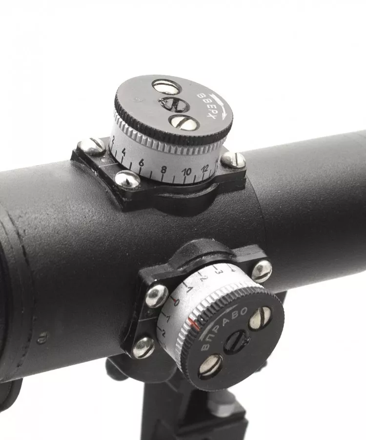 Барабанчики выверки с шагом 50мм / 100м обеспечивают своевременный ввод поправок на дальность и силу ветра, а также скорость перемещения цели.