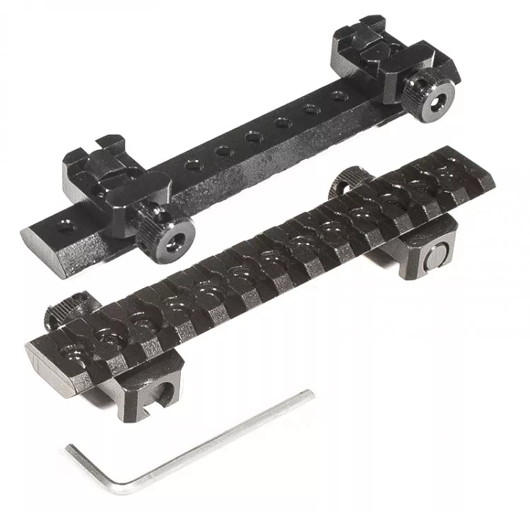 Крепление Weaver W/Л предназначена для создания базы Вивера на оружие, которое имеет крепежные элементы стандартов «ласточкин хвост», ширина базы которого составляет 11…14 мм. Кронштейн полностью выполнен из стали или алюминиевого сплава с длиной базы 135 мм, содержит 14 слотов для крепления оборудования. Кроме того стойки крепления базы Weaver W/Л можно переносить с шагом 10 мм. Это обеспечивает возможность установки планки Вивера на «ласточкин хвост» длиной от 40 до 130 мм. Также следует отметить, что таким способом можно устанавливать кронштейн Weaver W/Л как на цельную базу, так и на сегментированные участки крепления стандарта «ласточкин хвост»